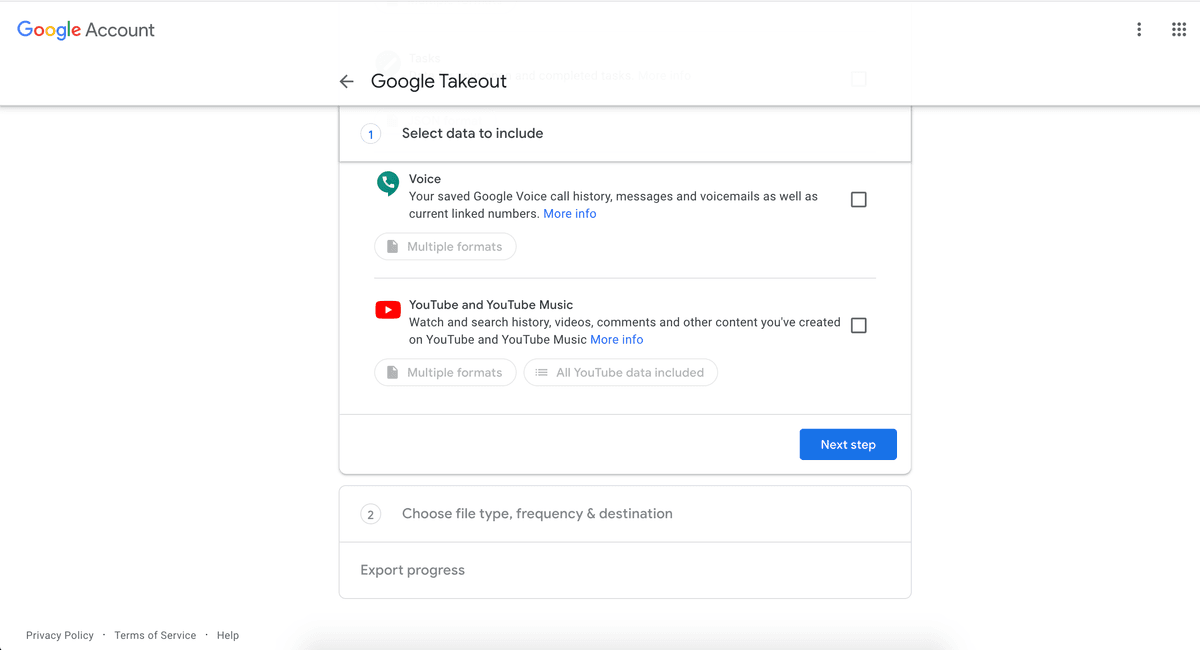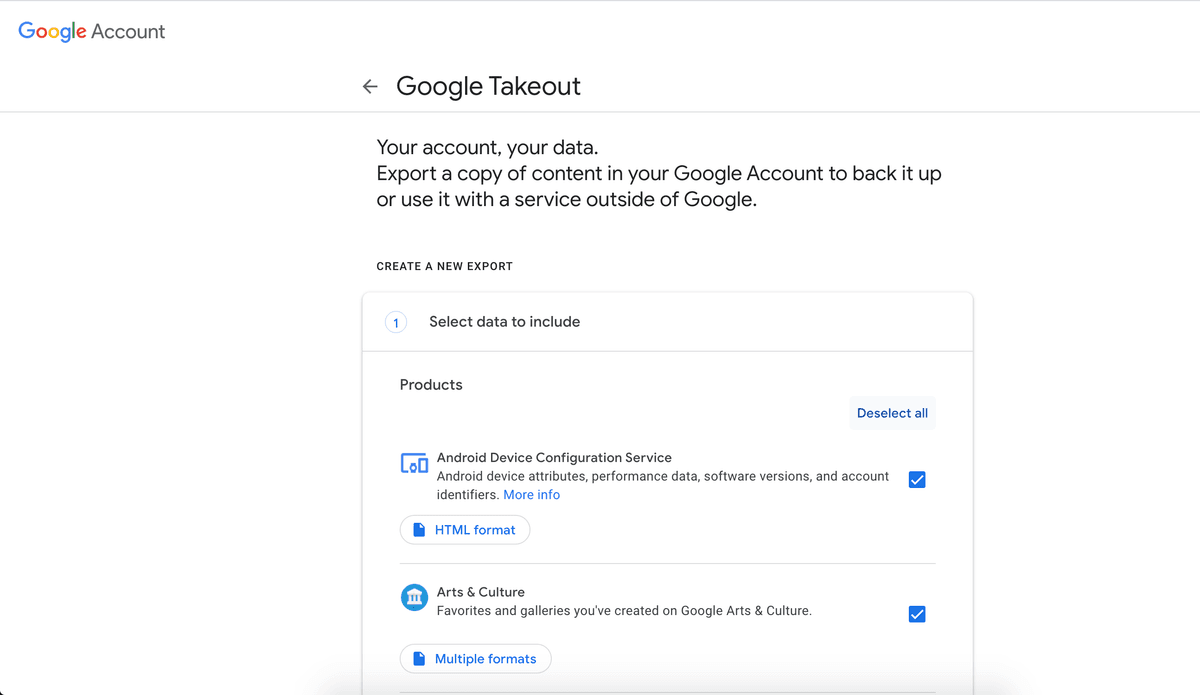 Google Takeout lists your Google data sources and enables you to export that data. Go to takeout.google.com and log in to your Google account.