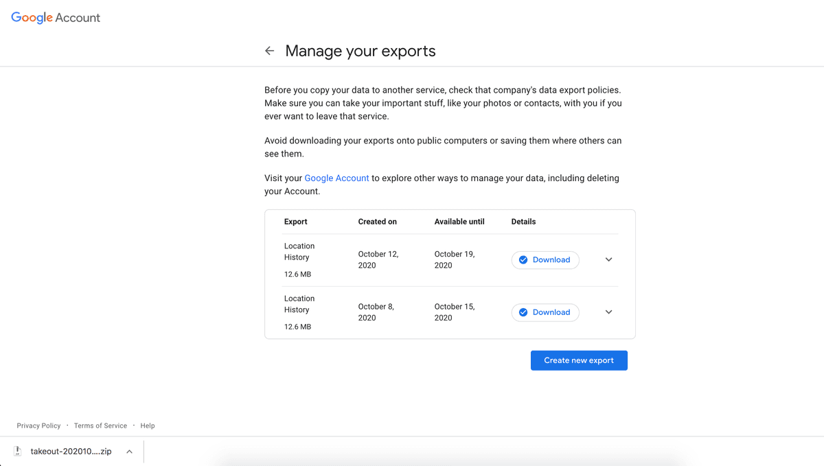 Choose how you want the export to be delivered (for ex: email). We recommend using the default values (export once, .zip, 2GB). Finally, click on "Create export".