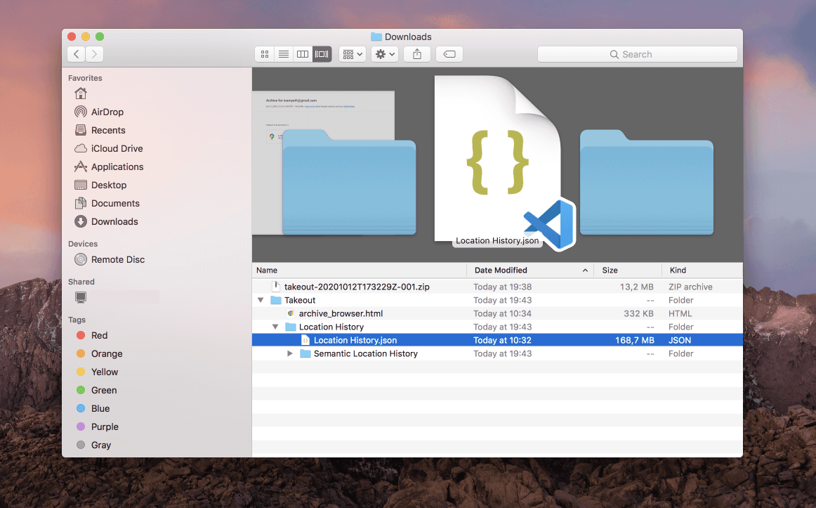 Once downloaded, unzip the folder. Find the file that is called Location History.json. This file may be named differently depending on your location and locale.